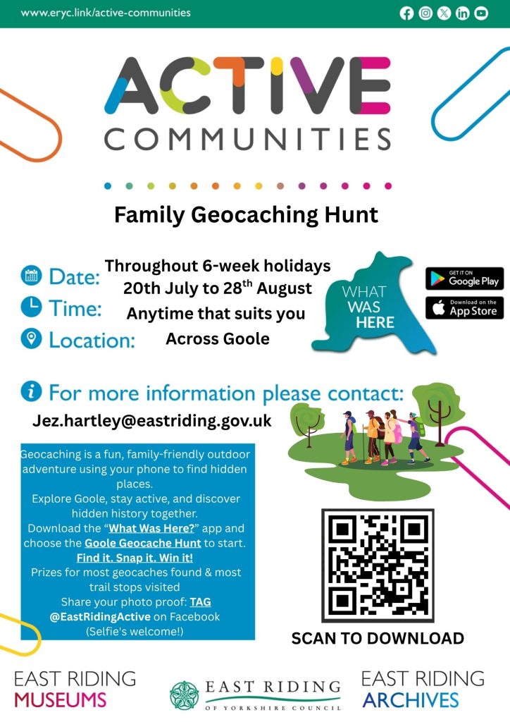 Take part in this Family Geocaching Hunt at any time during the six-week, school summer holidays to suit you. It’s a chance to explore Goole, stay active and discover the town’s hidden history together.